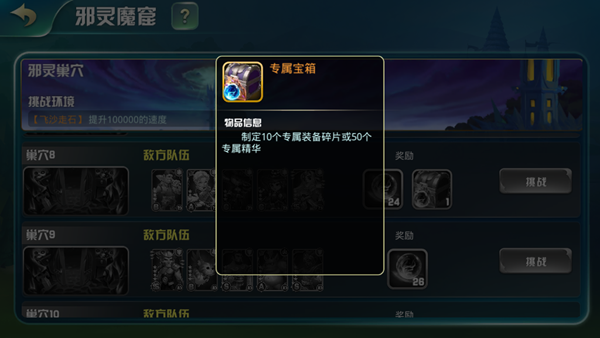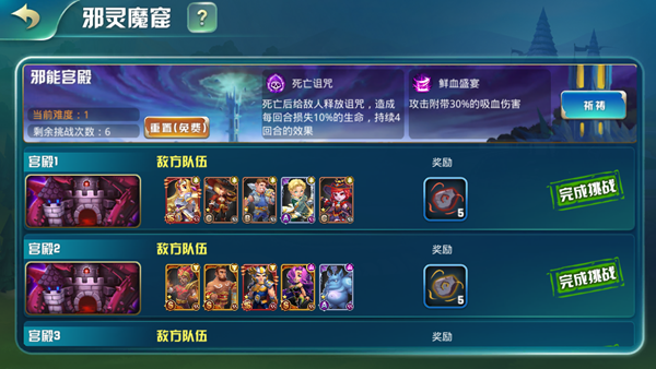 邪靈魔窟是裝備注魔材料和專屬裝備的主要產(chǎn)地,共計6個小關(guān)卡+1個BOSS關(guān)卡,每關(guān)敵人都有非常強力的buff,而且由于魔窟的毒氣英雄們不能戰(zhàn)斗太久,每天每位英雄只能上陣一次,實在打不過還可以“祈禱”,通過減少,每激活一個祈禱通關(guān)獎勵都會降低,殿下要仔細考慮尋找平衡點哦~