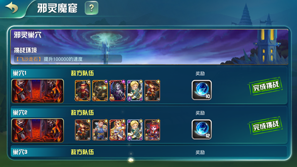 另一邊的邪靈巢穴又是另一番光景,巢穴每周都會形成一種特殊的環(huán)境,進入魔宮試煉的英雄每周都會在不同的環(huán)境下進行戰(zhàn)斗,比如英雄每次行動失去10%生命,或者所有英雄攻速增加50000點,所有英雄技能觸發(fā)率提高50%等等。所有的增益buff對英雄有利,不過有的英雄的加成更給力,主要的變故就在于減益buff,相當致命。