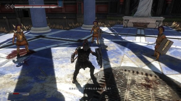 第一個(gè)“庭院Courtyard”是廣闊卻充滿著沙石的空間,但并沒有更多顯著的地形環(huán)境。游戲一開始非常直接,跳出了一波野蠻人的部隊(duì),去把他們?nèi)冀o砍倒吧!但接著游戲就開始變得更加有趣了,針刺與火焰的陷阱開始從地面竄出,讓我們不得不閃避這些額外的災(zāi)害地區(qū)(或者是把我們的敵人給打進(jìn)去)。接著戰(zhàn)斗中的目標(biāo)就變更了,迫使我們必須採取防御姿態(tài)先清空一個(gè)區(qū)域中的入侵者, 接著又放出了一些比一般野蠻人更強(qiáng)大的領(lǐng)隊(duì)出來。游戲中的操作非常令人熟悉,利用武器劈砍的連段與利用盾牌招架敵人攻擊,雖然有些時(shí)候競(jìng)技場(chǎng)中的黑影會(huì)讓游戲的視角沒辦法鎖定在我們角斗士的肩膀上,讓人不知道現(xiàn)在戰(zhàn)場(chǎng)上究竟發(fā)生了什么事情(但狂按攻擊通常就能讓你度過這種狀況)。
