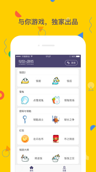 如何和面對(duì)面的朋友玩游戲?每一款與你游戲,都有單機(jī)、聯(lián)網(wǎng)、面對(duì)面模式,和朋友同時(shí)點(diǎn)擊游戲封面的“連結(jié)功能”,即可自動(dòng)發(fā)現(xiàn)對(duì)方。