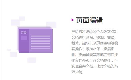 福昕PDF編輯器支持對文檔進(jìn)行刪除、添加、替換、裁剪、提取以及頁面重組等編輯操作,添加水印、頁眉頁腳、頁面背景等功能完善專業(yè)化文檔外觀;多文檔操作,可實現(xiàn)合并文檔、比對文檔的高級功能。