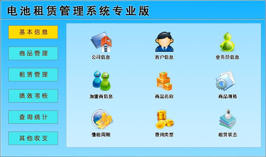 《電池租賃管理系統(tǒng)專業(yè)版》是一款適用于中小型電池租賃公司收費管理、租賃登記、查詢統(tǒng)計。主要包括商品管理、租賃管理、績效考核等功能。本管理系統(tǒng)多處具有快速輔助錄入功能,操作簡單,易學、易用;處理功能高效強大,是協(xié)助您的好幫手!