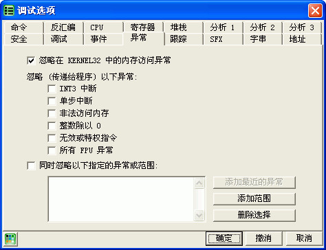 新手一般不需更改這里的選項(xiàng),默認(rèn)已配置好,可以直接使用。建議在對(duì) OllyDBG 已比較熟的情況下再來(lái)進(jìn)行配置。上面那個(gè)異常標(biāo)簽中的選項(xiàng)經(jīng)常會(huì)在脫殼中用到,建議在有一定調(diào)試基礎(chǔ)后學(xué)脫殼時(shí)再配置這里。