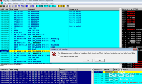 點(diǎn)擊后,ollydbg會(huì)提示重新加載可執(zhí)行文件,我們點(diǎn)擊yes,如下圖。