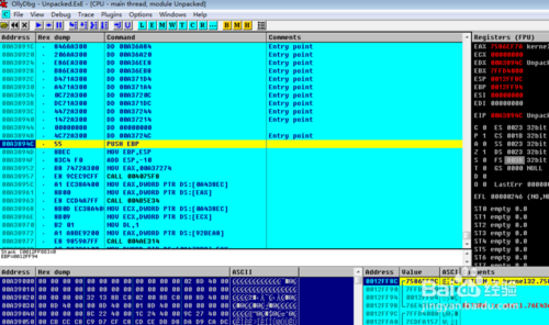 數(shù)據(jù)格式:OllyDbg 的數(shù)據(jù)窗口能夠顯示的所有數(shù)據(jù)格式:HEX、ASCⅡ、UNICODE、 16/32位有/無(wú)符號(hào)/HEX整數(shù)、32/64/80位浮點(diǎn)數(shù)、地址、反匯編(MASM、IDEAL或是HLA)、PE文件頭或線程數(shù)據(jù)塊。
