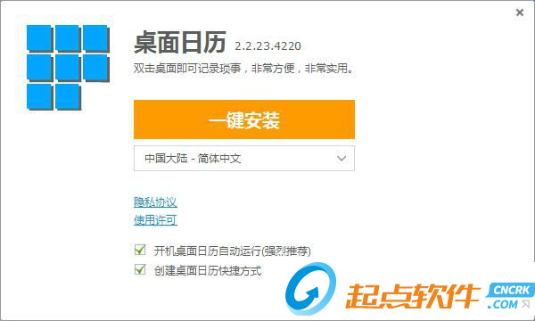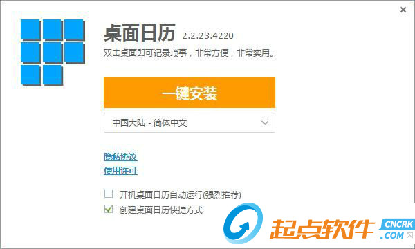 這時(shí)候,我們就進(jìn)入了DesktopCal的安裝向?qū)?。安裝向?qū)е鹘缑娣浅:?jiǎn)潔,安裝向非常簡(jiǎn)潔。點(diǎn)擊一鍵安裝即表明隱私協(xié)議和使用許可。點(diǎn)擊一鍵安裝,就可以將DesktopCal安裝到電腦里面;