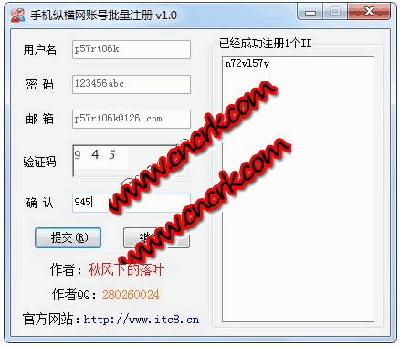 手機(jī)縱橫網(wǎng)賬號(hào)批量注冊(cè),自動(dòng)生成并輸入用戶名。默認(rèn)密碼:123654abc。關(guān)閉程序后,所有注冊(cè)成功的id將保存到程序目錄下的id.txt文件里,格式為:id----密碼。