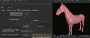 說明基本著色器創(chuàng)建和分配。 創(chuàng)建相機(jī),小馬和粉紅色材質(zhì)并將其合并到單個(gè)場景圖中。 然后將PinkMat材質(zhì)指定給小馬幾何體,并使用GafferThree節(jié)點(diǎn)創(chuàng)建指定了聚光燈著色器的燈光。 從GafferThree節(jié)點(diǎn)做一個(gè)交互式渲染應(yīng)該顯示粉紅色閃亮的小馬的所有榮耀。