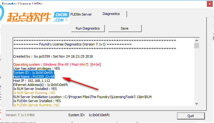 7、編輯xf_foundry.lic替換HOST_NAME MAC_ADDRESS PORT。您可以使用rlmutil.exe獲取這些信息,這是一個(gè)簡單的dos窗口ipconfig / all或者您可以啟動(dòng)Foundry License Utility并選擇Diagnostics —— Run Diagnostics,您將找到您的主機(jī)名,您的mac地址(系統(tǒng)ID)然后保存