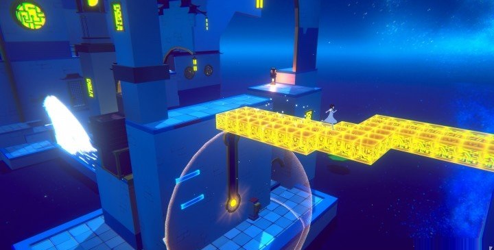 也有一些機(jī)關(guān)才露尖角,卻沒(méi)有得到更多的空間。同樣是神音峽谷中的鏡像木偶就是個(gè)有趣且惹人懷念的玩法,“同時(shí)操控兩名角色”,每個(gè)諳熟此道的作品都有自己的包裝方式,在本作中則是曇花一現(xiàn);隱形迷宮的出現(xiàn)令人眼前一亮,形式是驚艷的,但關(guān)卡設(shè)計(jì)顯然缺乏考究,隨便走走就過(guò)去了,而且迷宮中的敵人完全是傻站著,隔著墻壁就能輕松消滅;一些帶有致敬意味的謎題,反倒意外地讓人感到新鮮,比如被《蠟燭人》中滾瓜爛熟的光磚棧道,在本作中借助光劍系統(tǒng)的特點(diǎn)衍生出了不一樣的玩法和感受。
