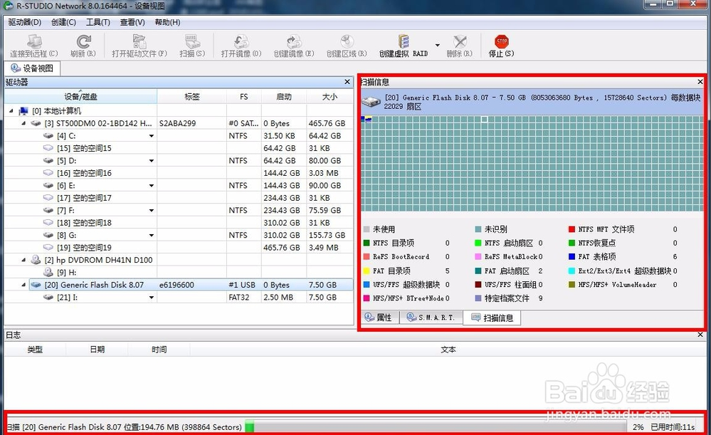接著軟件就開始掃描U盤的文件信息,右側(cè)是以小方格顯示的,下方會有顏色對應(yīng)的說明,在軟件界面最下方是掃描的進(jìn)度,有已用時間和剩余時間,這樣就能很直觀的了解掃描的情況。