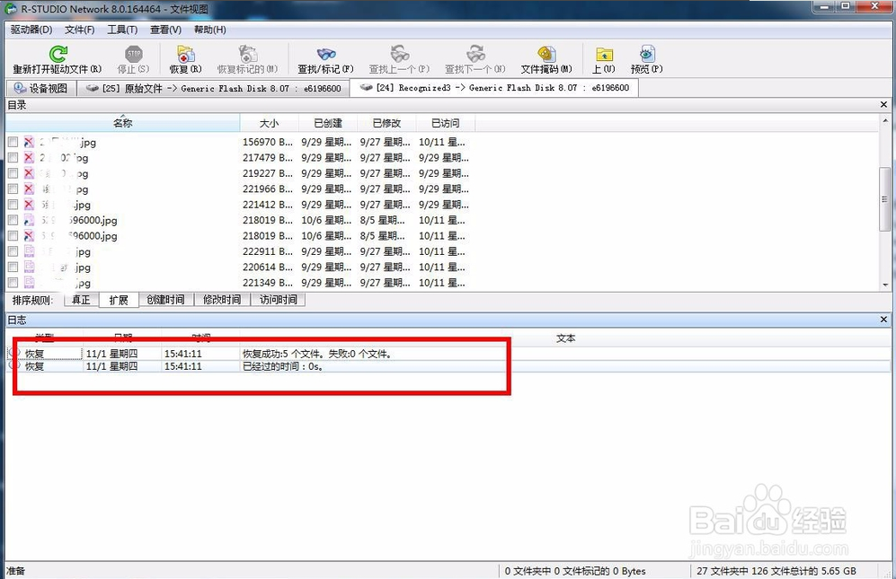 接著文件就會開始恢復(fù),恢復(fù)完成后在下方會顯示恢復(fù)的日志信息,成功或者失敗都會有顯示的,成功恢復(fù)的就可以找到保存的位置查看恢復(fù)的文件了。