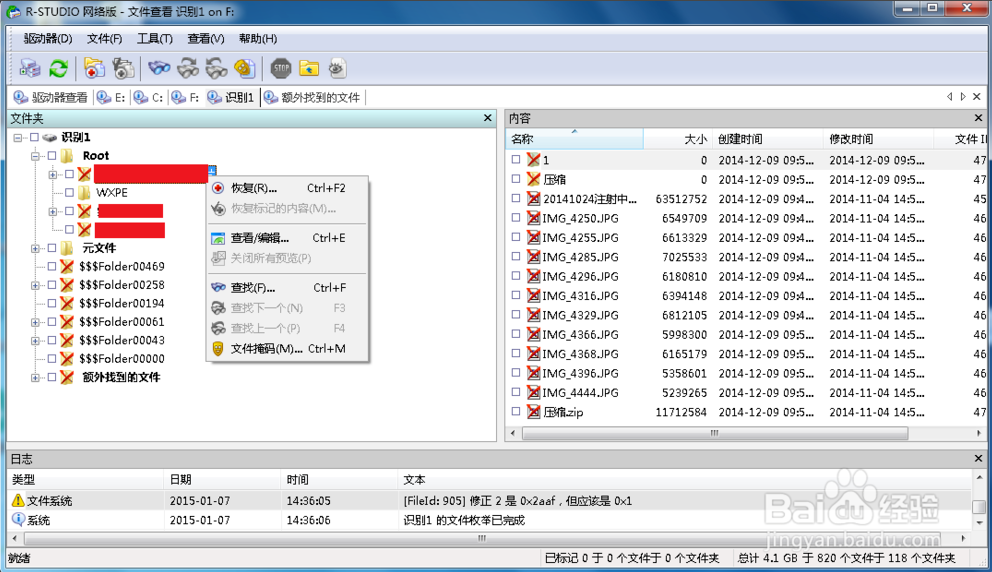 我們這里以U盤為例進(jìn)行說明,圖中F盤為U盤,鼠標(biāo)移至F盤處右擊,在窗口處選擇掃描,掃描F盤內(nèi)的文件信息。如圖所示,掃描結(jié)束后會出現(xiàn)識別1與額外找到的文件,雙擊進(jìn)去查看。