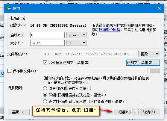 接著會彈出掃描的設(shè)置界面,這里會顯示磁盤的大小,在設(shè)置界面的下方會有個掃描視圖,分為三種情況,一種是簡單,只是掃描進(jìn)度,一種是詳細(xì),這個掃描起來比較慢,因為掃描啥都顯示,肯定慢,最后一種就是無,也就是啥也不顯示,直接后臺運行,這個當(dāng)然是最快的了,根據(jù)自己的情況選擇,選擇好后點擊掃描選項。