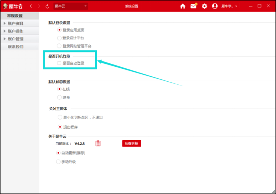 是否開機登錄是指電腦開機后自動登錄,如果您想要犀牛云登錄賬戶與您電腦開機同步則勾選,不同步則不勾選;