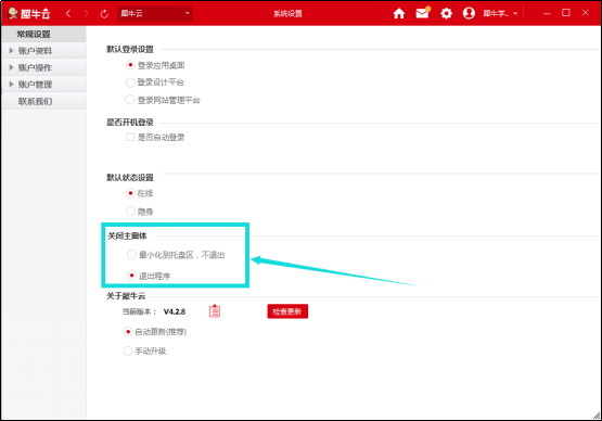關閉主窗體是指關閉犀牛云窗口后的狀態(tài),可以選擇最小化到托盤區(qū),或者是直接退出程序。