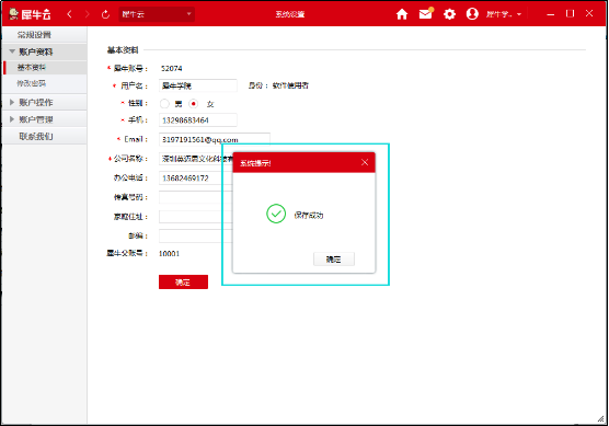 第四步:犀牛賬號基本資料編輯后,點擊【確定】彈出系統(tǒng)提示框,點擊【確定】完成資料的修改(如圖四);