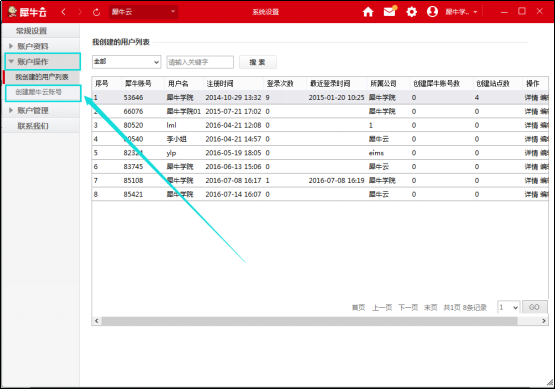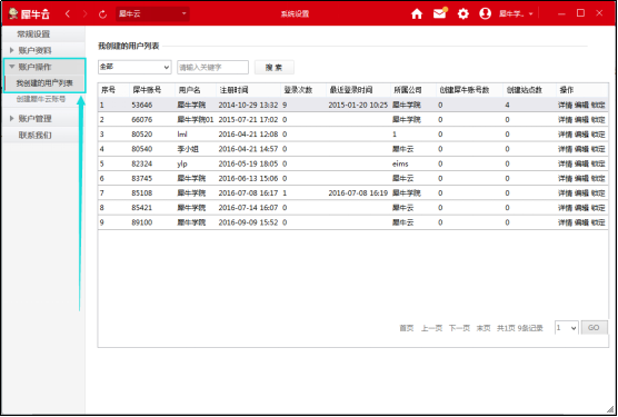 第五步:創(chuàng)建成功后,在用戶操作下點擊【我創(chuàng)建的用戶列表】,可以查看添加的網站子管理員用戶列表及子管理員的犀牛賬號、用戶名、注冊時間和所屬公司;點擊操作下的【詳情】可查看到子管理員的基本信息。