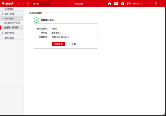 第四步:如需繼續(xù)添加請點擊【繼續(xù)添加】犀牛帳號,不再添加則點擊【返回】(如圖四);