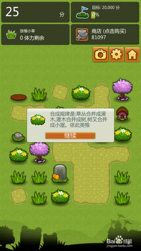 合成順序(括弧內(nèi)代表該建筑分值)小草(5)-----草叢(20)-----大樹(shù)(100)-----房子(500)----- 一層樓(1500)------兩層樓 (5000)-----城堡(20000)------懸浮塔(100000)------三重鎮(zhèn)(500000)