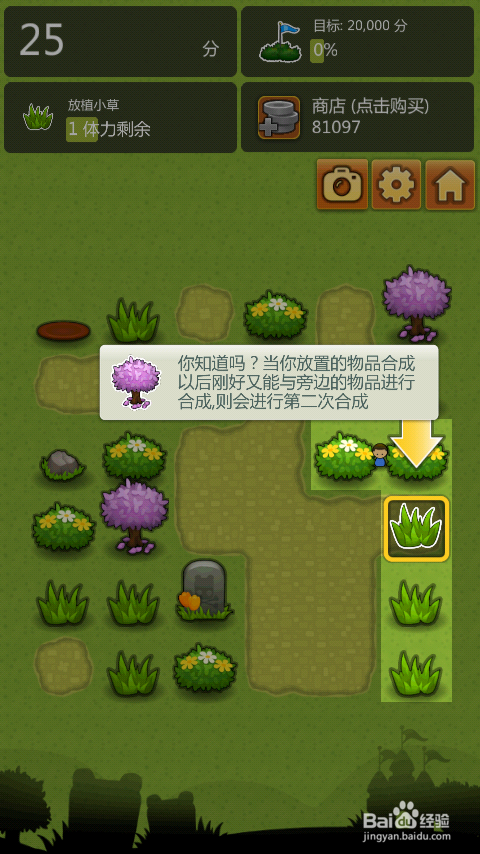 2.游戲規(guī)則,三重鎮(zhèn)嘛,所以是三三一升級(jí)別。三個(gè)小草變成一個(gè)小圓團(tuán),三個(gè)小圓團(tuán)變成一顆大樹(shù),三棵大樹(shù)變成一座小紅屋子; 三個(gè)小紅屋子變成一棟小樓(還可以用水晶將兩個(gè)小紅屋子變成一棟小樓,后面同樣適用),三個(gè)小樓變成一棟大別墅...(哈哈,目前我最多就建出一個(gè)水游臺(tái),不知道還有沒(méi)有玩到更高的朋友,能把水游臺(tái)再合并成神馬未知物?)