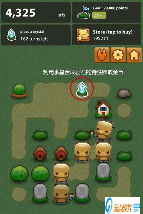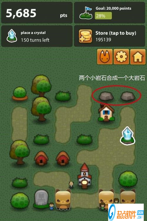 然后,繼續(xù)放置第二個(gè)水晶,讓它也變成巖石。放置第三個(gè)水晶的時(shí)候,就可以讓兩個(gè)小巖石變成一個(gè)大巖石。大巖石出現(xiàn)在第三個(gè)水晶放置的位置上。