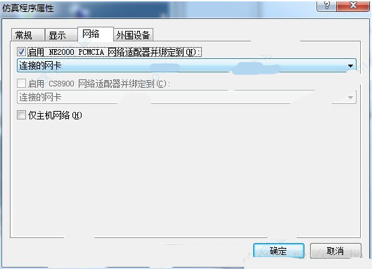 2、配置模擬器文件-->配置-->網(wǎng)絡(luò)-->勾選“啟用NE2000 PCMCIA 網(wǎng)絡(luò)適配器并綁定到(N)”在下拉框中選擇“連接的網(wǎng)卡”或者PC機(jī)正在使用的網(wǎng)卡(如圖二)-->確定