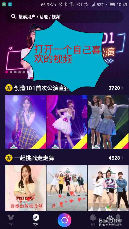如何使用騰訊微視?首先下載進入主頁,有代言人發(fā)布的微視。還有各種跟拍、分享和評論等。