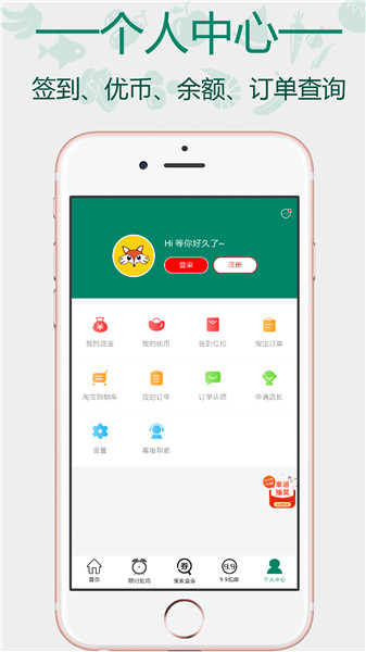 3.內(nèi)嵌手機(jī)淘寶模塊,一鍵免費(fèi)領(lǐng)取優(yōu)惠券并跳轉(zhuǎn)至手機(jī)淘寶對(duì)應(yīng)商品下單。需先登陸手機(jī)淘寶賬號(hào),下單時(shí)自動(dòng)使用內(nèi)部?jī)?yōu)惠券。所有已購(gòu)買(mǎi)訂單在淘寶、支付寶APP中均可查詢訂單詳情。