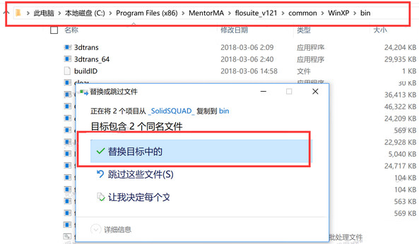 5、安裝完成后,打開安裝包_SolidSQUAD_目錄,將破解文件MGLS.DLL和MGLS64.DLL復制到安裝目錄下覆蓋源文件,默認路徑為C:\Program Files (x86)\MentorMA\flosuite_v121\common\WinXP\bin