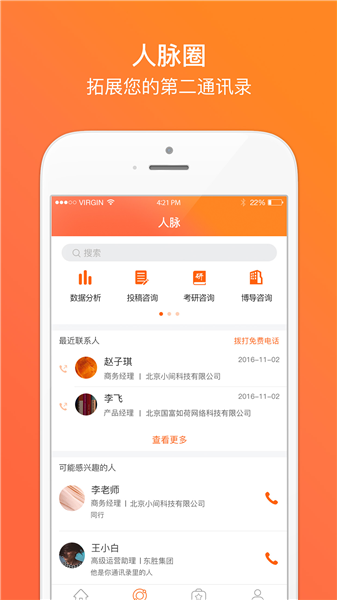 1、數(shù)萬專業(yè)人脈,一鍵溝通這里活躍著海量專業(yè)達人,可以根據(jù)姓名、單位、學(xué)校、職位、擅長知識等多個維度檢索到他們,網(wǎng)絡(luò)電話一鍵溝通。
