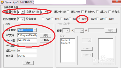 ①:此區(qū)域是選擇交換機(jī)和路由器的個(gè)數(shù)(有點(diǎn)廢話)②:這個(gè)地方是選擇設(shè)備類型,IOS路徑,idle-p值NPE類型,虛擬(表示虛擬設(shè)備的RAM所占的內(nèi)存大小,因?yàn)閐ynamips在模擬時(shí)候需要將主機(jī)的物理內(nèi)存模擬成模擬設(shè)備的RAM)