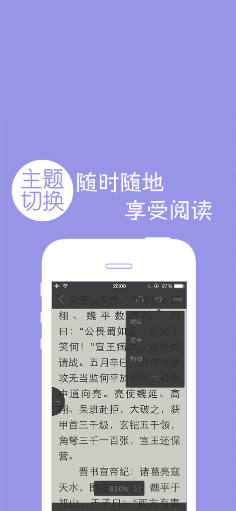 可以根據(jù)您的閱讀習(xí)慣設(shè)置多種不同的閱讀主題(比如左手操作,被窩主題,地鐵主題等),在不同的閱讀環(huán)境下隨時切換最適合的閱讀方式。