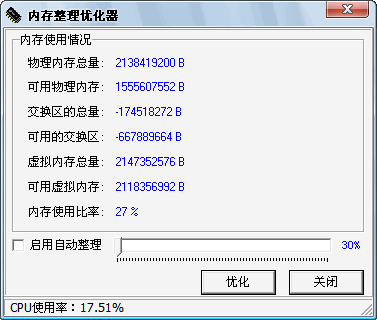 內(nèi)存整理優(yōu)化器 V2.45 綠色版 是一款極好的內(nèi)存整理優(yōu)化工具,能夠在不影響系統(tǒng)速度的情況下有效的釋放內(nèi)存,進(jìn)行內(nèi)存的優(yōu)化整理。它不但能夠讓用戶按照需要隨意調(diào)整所要整理的內(nèi)存范圍,同時(shí)更具有強(qiáng)大的自動(dòng)整理功能,您可以自由設(shè)置自動(dòng)整理的比率
