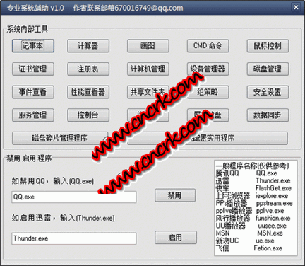 系統(tǒng)輔助工具,讓你發(fā)現(xiàn)系統(tǒng)的工具也不少,提供禁用qq,迅雷,上網(wǎng),等功能,純綠色軟件,不用安裝,卸載,讓你的電腦更干凈。