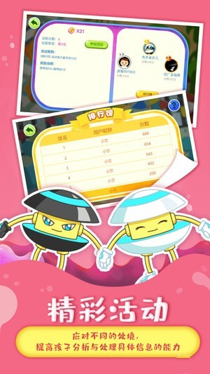 不同于傳統(tǒng)的對弈軟件,本品的精彩活動以圍棋對弈規(guī)則為基礎(chǔ),每月更換不同細(xì)節(jié)規(guī)則,讓孩子試著應(yīng)對不同的處境,提高分析與處理具體信息的能力。排名靠前的用戶還能獲得各種道具獎勵。每天有積分獲取上限,不用擔(dān)心因為耗時過長影響視力。