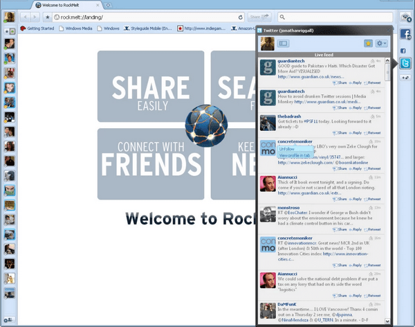 RockMelt 與 Chrome 的使用習(xí)慣完全相同,習(xí)慣 Chrome 的同學(xué)很容易上手的。另外 RockMelt 的安裝及使用都需要登錄 Face book,需要特殊方式連接,你懂的。相比于中國(guó)互聯(lián)網(wǎng)混亂且流氓的 IE 殼瀏覽器大戰(zhàn),RockMelt 則能給人更加互聯(lián)網(wǎng)的感覺,讓你在使用瀏覽器的過(guò)程中將 SNS 融入其中。可能在國(guó)內(nèi)大多數(shù)人都無(wú)法正常使用 RockMelt,但這不是重點(diǎn),希望能給開發(fā)者帶來(lái)靈感。【功能介紹】
