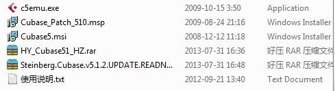 1.首先在本網(wǎng)站下載Cubase5中文版解壓安裝包,生成以下幾個(gè)文件:Cubase5.msi;c5emu.exe;Cubase_Patch_510.msp。