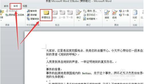 3、在“審閱”的功能區(qū),找到“創(chuàng)建批注”。如下圖所示。此操作在菜單欄就可以找到相關(guān)的按鈕,按照小編提示的過程操作即可。