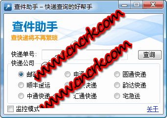 洛麗查件助手 V1.3 綠色免費(fèi)版 洛麗查件助手,功能就是方便快遞查詢,共支持9個(gè)家常見的快遞公司的單號(hào)查詢:郵政ems,申通快遞,圓通快遞,順豐速運(yùn),天天快遞,韻達(dá)快遞,中通快遞,匯通快遞,宅急送!如果你經(jīng)常網(wǎng)購(gòu),或者開網(wǎng)店,這款軟件值得你收藏!