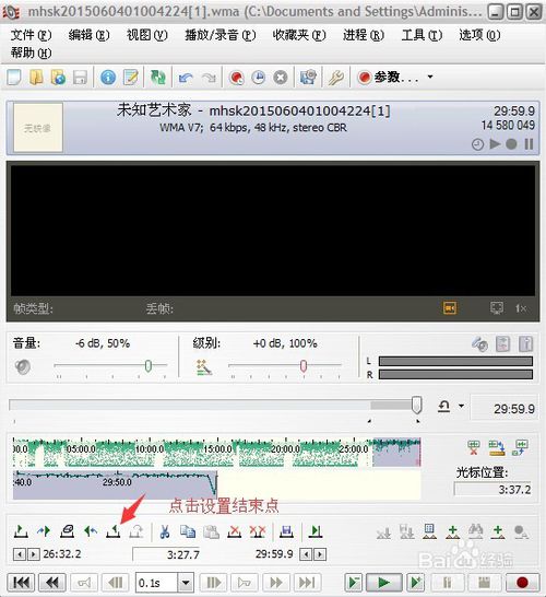 5.通過不斷點擊整個音樂的波形圖和局部波形圖尋找需要剪輯的結(jié)尾位置,點擊“設(shè)置選擇結(jié)束”按鈕。