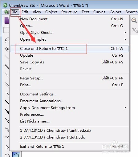 4、 這時會打開ChemDraw Std軟件,我們可以在該軟件繪制化學分子結構,繪制完成后點擊 “File”—“Close and Return to 文檔”,繪制的化學分子結構就會顯示在Word中。