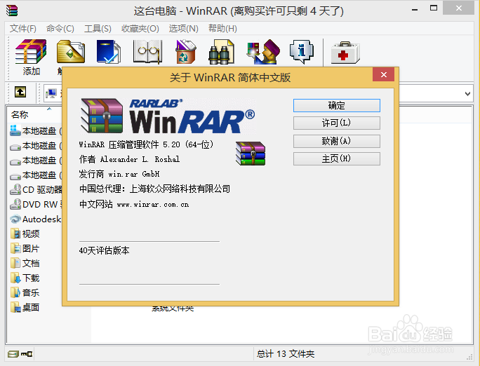 選擇“幫助—>關(guān)于winrar”我們可以看到下面顯示“40天評(píng)估版本”這是未注冊(cè)的