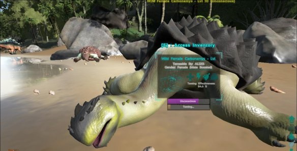 接著恐龍會(huì)慢慢進(jìn)食我們投放給他們的食物,需要注意的是被馴服的恐龍的對(duì)話框中以后有兩個(gè)進(jìn)度槽,一個(gè)是紫色的,這個(gè)代表著恐龍的昏迷時(shí)間,一個(gè)是金色的,代表著馴服的進(jìn)度