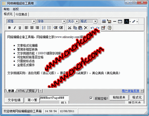 網(wǎng)絡編輯超級工具箱提供的文章快速格式化功能,可幫助您快速格式化文章,使之成為合乎規(guī)范和標準的文章格式,能有效提高編輯工作效率,加快工作進度。