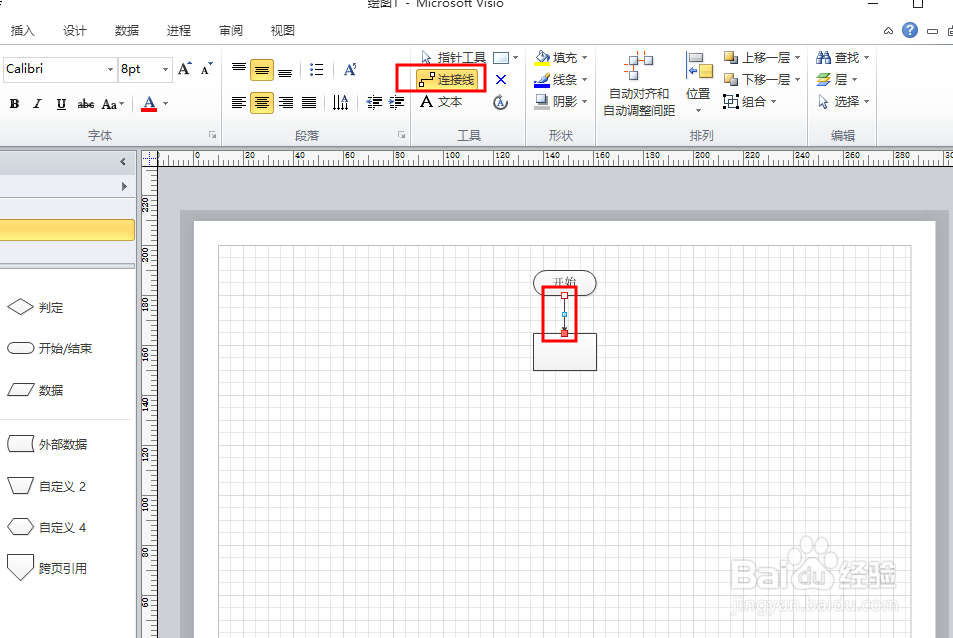 同理 選擇一個流程框 拖拽到剛剛的正下方 然后鼠標選中連接線(當然可以選擇連接線的樣式),然后從開始框下線點擊鼠標拉到流程框的上線 點擊 連接線即可完成 (實際操作有提示的,很簡單)