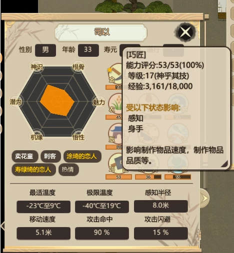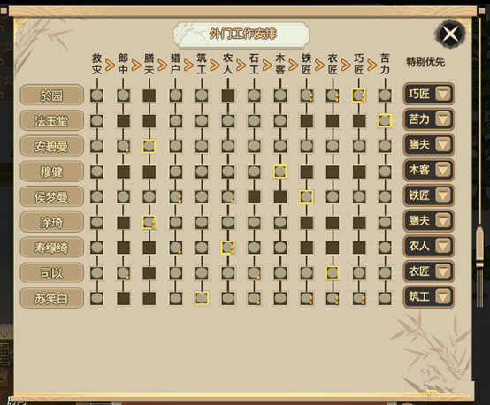 鐵匠、衣匠、巧匠:雖然這三項工作對應(yīng)的產(chǎn)出物品不同,但是這三項工作都會受到人物面板“巧匠”能力的影響,而產(chǎn)出物品的品質(zhì)則受到人物面板“雅藝”能力的影響。因此,在制作物品時,需要安排對應(yīng)能力較高的外門弟子來執(zhí)行。