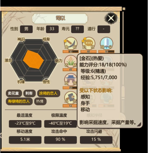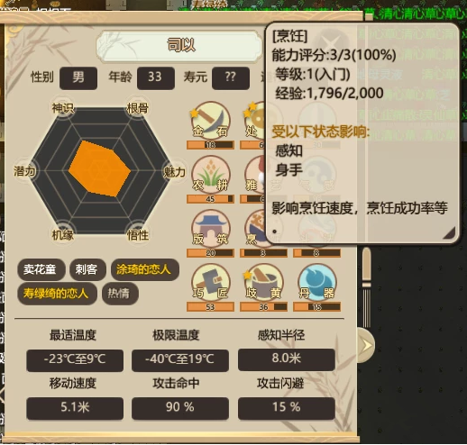 農(nóng)人:一個門派幾十張嘴,想要解決日趨增長的口糧需求,種植農(nóng)作物,就顯得尤為重要。農(nóng)人的工作就是種田以及收獲,該項工作的效率會受到人物面板中“農(nóng)耕”能力的影響。而農(nóng)作物的生長會受到土地的肥沃程度以及溫度的影響,因此在合適的時節(jié),在合適的土壤上進行種植,也是需要玩家時刻謹記的。