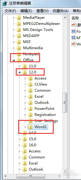 ·依次雙擊打開“Software”->“Microsoft”->“Office”->"12.0",