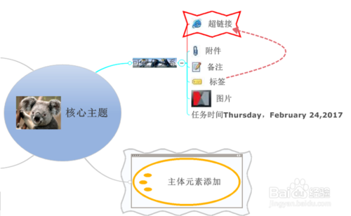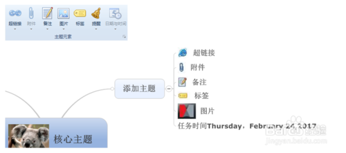 通過菜單插入->主題元素工具,可以為主題添加超鏈接、附件、備注、圖片、標簽、提醒以及指定任務信息等信息。